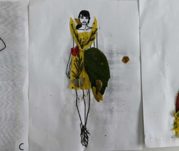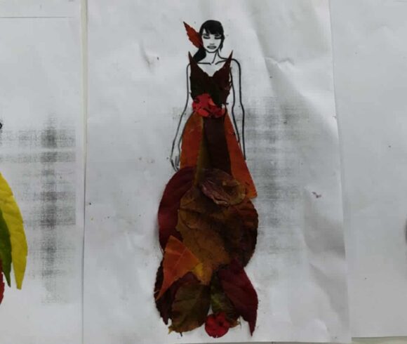 В хода на урока деветокласниците наблюдаваха формите, цветовете и текстурите на есенните листа, след което приложиха знанията си по моделиране, композиция и моден дизайн, за да създадат модели на облекла.